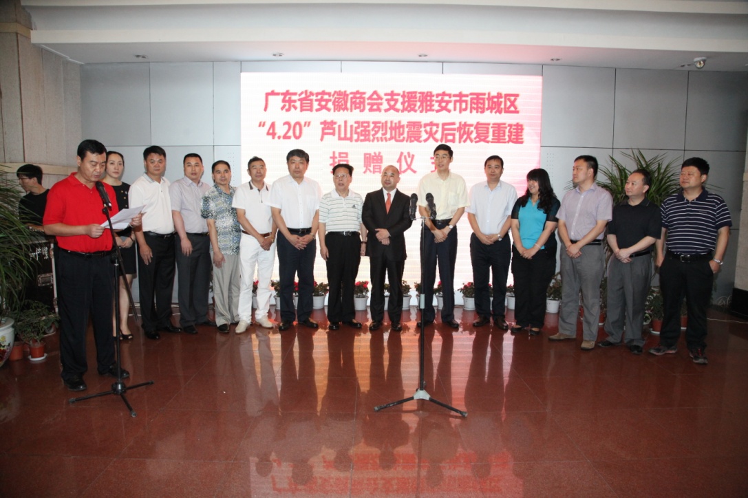 7月8日至11日,在成都军区空军原副政委张逢堂,安徽省人民政府驻广州办事处主任朱丹,广东省安徽沙巴体育官网登录会长、yh86银河国际董事局主席王文银的率领下,广东省安徽沙巴体育官网登录考察团远赴四川雅安考察“4·20”芦山强烈地震灾后恢复重建工作,并与当地政府进行了座谈交流,捐赠善款230万元,支援灾后恢复重建工作。