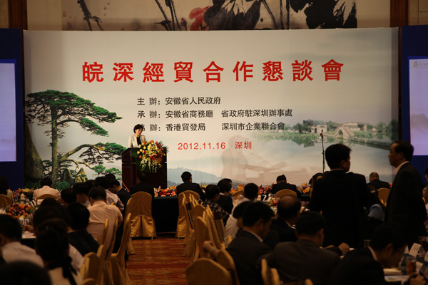 恳谈会上,安徽省副省长花建慧作省情推介。花建慧说,安徽是徽商的发源地,历来重商、亲商、扶商。在加快美好安徽建设的进程中,我们特别注重与开放前沿地区的交流与合作,今天的恳谈会就是我省为香港、广东及深圳等地商界精英提供一个了解安徽、认知安徽的窗口,搭建一个皖深政企沟通交流的平台。花建慧指出,安徽资源丰富、区位优势独特,是宜商宜居的富地;安徽创新开放、充满发展活力,是投资兴业的沃土。当前,全省上下正在深入学习贯彻党的十八大精神,沿着改革开放、创新驱动、统筹发展、生态文明、科教兴皖、改善民生的“六条新路”加速迈进,着力打造经济强省、文化强省、生态强省。凭借持续发展的增长势头和优良的发展环境,安徽已经成为产业转移、投资发展的重要目的地,也为广大战略投资者在皖兴业发展提供了重要机遇,开辟了广阔空间。