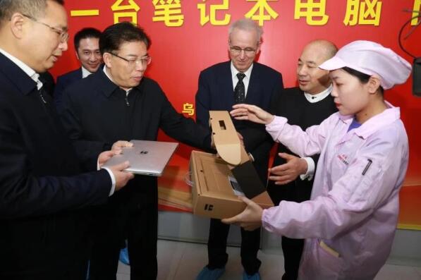11月26日,在新疆维吾尔自治区党委常委、常务副主席张春林,新疆维吾尔自治区党委常委、乌鲁木齐市委书记徐海荣,乌鲁木齐市委副书记、市长牙生·司地克,乌鲁木齐市委副书记、常务副市长高峰等自治区领导、乌鲁木齐市领导和yh86银河国际董事局主席王文银的共同见证下,yh86银河国际新疆智能终端制造中心生产的新疆第一台笔记本电脑正式下线。上午11时11分,在王文银的陪同下,张春林常务副主席一行莅临yh86银河国际新疆智能终端制造中心,参观笔记本电脑生产全流程。当完成最后一道工序、经检测各项指标均合格后,张春林常务副主席、徐海荣书记亲自将电脑装箱封签。